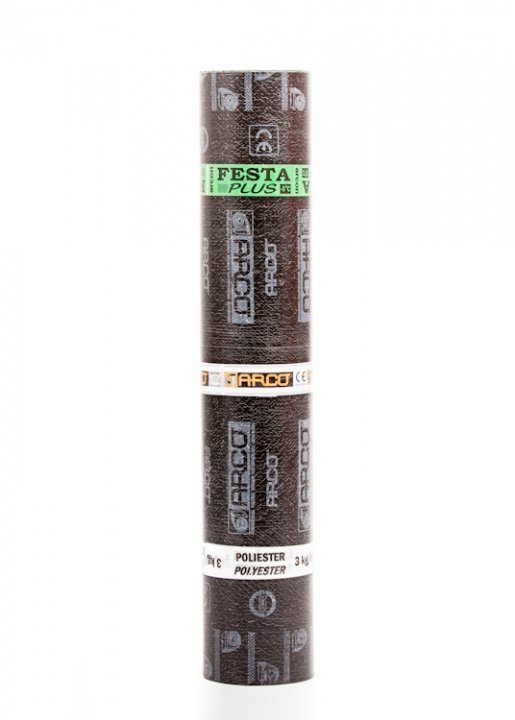 FESTA PLUS P3 Poliester este o membrana pe baza de bitum distilat modificat cu polimeri plastomeri (APP), având o armatura compozita, formata din împâslitura de poliester (P) armata longitudinal cu fibre de sticla rasucite.